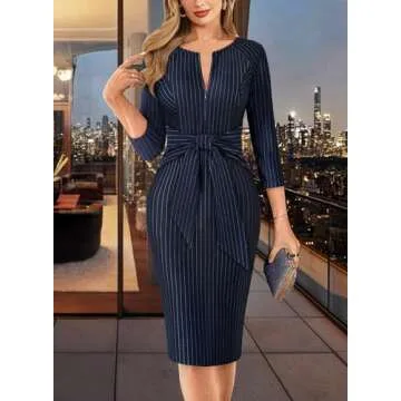 Introducing the elegant VFSHOW Women's Dark Blue and White Striped Front Zipper Tie Waist Bow Slim Work Business Office Party Bodycon Pencil Sheath Dress, your go-to outfit for any professional occasion or stylish outing. Designed with a perfect blend of sophistication and flirtation, this dress features a classic crew neckline and chic 3/4 sleeves. The unique front zipper allows you to adjust your style, providing a daring look when unzipped...