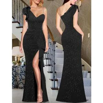 VFSHOW Womens Elegant Ruffle One Shoulder Beaded Strap Wedding Formal Maxi Dress 2023 Ruched Slit Cocktail Evening Sparkly Long Gown (Black, Medium) 3119 BLK M