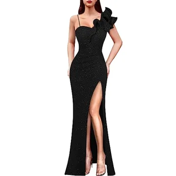 Show more Introducing the VFSHOW Women's Elegant Ruffle One Shoulder Strap Maxi Dress, a captivating blend of sophistication and modern style designed for the fashion-forward woman. This exquisite gown showcases a stunning v-neckline and features a unique one-shoulder design paired with a graceful double-layered ruffle sleeve. The ruched waist accentuates your curves, creating a flattering silhouette, while the maxi length exudes elegance. Available in a chic black color, this dress is perfect for a range of occasions from formal events to evening parties, making it a versatile addition to your wardrobe. The real standout feature is the thigh-high split with an adjustable zipper that allows you to customize how much leg you want to reveal – whether you're dancing the night away or walking down the aisle!