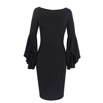 Show moreStep into elegance with the **VFSHOW Women's Ruffle Bell Sleeves Business Cocktail Party Sheath Dress**. Designed for the modern woman, this stunning dress features an eye-catching round neckline and beautiful ruffle bell sleeves that offer a unique flair to your outfit. Crafted meticulously to highlight a slim fitting silhouette, the sheath design beautifully hugs your curves, while the concealed back zipper ensures a sleek look. The added back slit not only enhances your elegance but also allows for comfortable movement, making it the perfect choice whether you're at a cocktail party, business event, or a wedding.