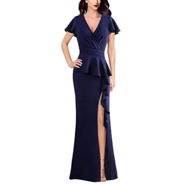 Introducing the VFSHOW Women’s Sparkly Ruched Wrap V Neck Ruffle Peplum Split Formal Evening Gown, a stunning addition to your wardrobe designed specifically for elegant occasions. This beautiful navy blue maxi dress combines sophistication with comfort, making it the ideal choice for wedding guests, bridesmaids, or any formal event. Tailored with exquisite attention to detail, it features a flattering wrap V neckline, ruffle cap sleeves, and a asymmetrical peplum...
