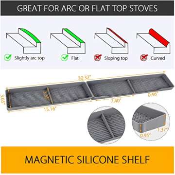Show moreIntroducing the VGIGCICV Magnetic Stove Top Shelf, your ultimate kitchen companion designed for the modern cook! Crafted with an upgraded design that fits up to 30.32 inches long, this spice rack organizer not only maximizes your space but enhances the efficiency of your cooking environment. Built with six strong magnetic iron pieces, it assures a secure attachment to your stove top, allowing for easy installation without the hassle of tools. Measuring 30.32 x 3.65 x 1.37 inches, it's perfectly designed to accommodate both flat and slightly curved stoves, ensuring versatility in every kitchen setting. Made from thick, high-grade silicone, you can rely on this mat to stay cool during the most intense cooking sessions, offering a safe environment for all your spices and essentials.