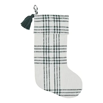 Show more Get ready to elevate your holiday decor with the stunning Plaid Christmas Stocking, meticulously crafted from 100% cotton. Measuring a generous 12x20 inches, this stocking stands out with its chic and modern design that features rich pine green stripes laid against a crisp white background. The high-quality textured fabric is complemented by a soft flannel batting, ensuring that it not only looks good but feels luxurious as well. Each stocking is finished off with an elegant attached tassel that adds a touch of sophistication to your fireplace mantle.
