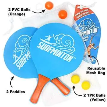 Show more Bring the beach party alive with the VIAHART Surfminton Classic Blue and Orange Beach Tennis Wooden Paddle Game Set. This high-quality game set is designed for ultimate fun in the sun, featuring two thick plywood paddles with sturdy plastic handles, four different balls (two PVC and two TPR), and a convenient reusable mesh bag for easy transport. A perfect addition to any beach or backyard gathering, this set promises hours of entertainment for players of all ages and skill levels.