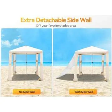 Show more Introducing the Vibemo Beach Cabana, your ultimate outdoor escape! Measuring 6.2' x 6', this portable canopy is expertly crafted from durable, waterproof fabric that guarantees refreshment and protection from harmful UV rays. Enjoy the great outdoors without compromising your comfort, as the Vibemo Cabana features a detachable side wall that enhances your shade zone. Designed with UPF 50+ protection, it is perfect for families with children or anyone enjoying a day at the beach. Simply detach the side wall during gusty winds to ensure your cabana remains anchored and safe.