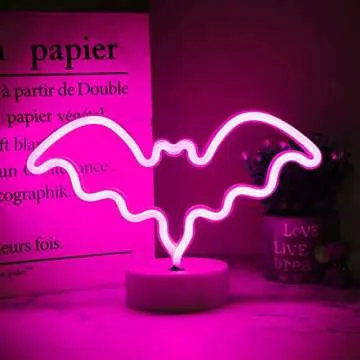 Vicila LED Neon Bat Lights Halloween Decorations, Bat Shape Neon Signs Night Lights Battery Operated Desk Table Lamp for Bedroom, Bar, Wall, Spooky Decor-Bat with Holder Base(Pink)
