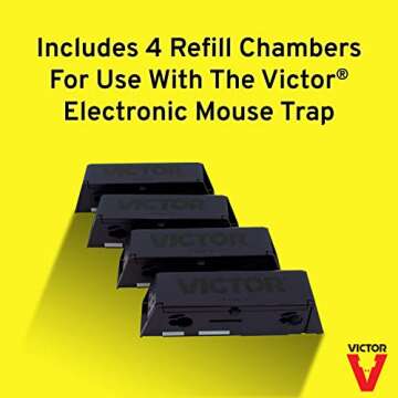 Show moreIntroducing the Victor Chambers – 4 Pack M250S-RF4 Indoor Electronic Mouse Trap Disposable Refill Chambers, a revolutionary addition to your home pest control arsenal. Designed specifically for use with the Victor Electronic Mouse Trap (sold separately), these refill chambers ensure your mouse trapping experience is seamless, efficient, and most importantly, effective. Each pack comes with four disposable chambers, making it incredibly convenient to keep your traps ready and functioning at their best. With its built-in bait cup, maintaining proper bait placement has never been easier, enhancing your chances of a successful catch every time.