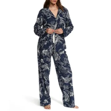 Show more Indulge in the ultimate comfort with the Victoria's Secret Flannel Pajama Set. This luxurious sleepwear set features a long sleeve button-down shirt and matching pants, created from a supersoft cotton-modal blend that offers both coziness and breathability. With its stylish Noir Navy Pegasus print, this pajama set will not only make you feel comfortable but also effortlessly fashionable during your leisurely evenings at home. The brushed finish of the fabric adds a layer of warmth without compromising on weight, making it a perfect choice for all seasons.
