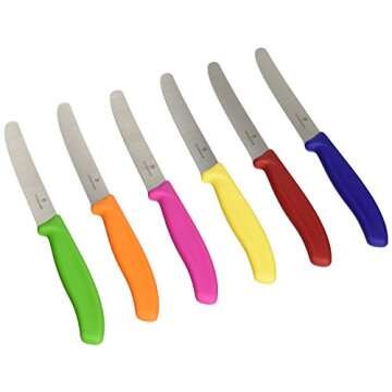 Show more Introducing the Victorinox Swiss Stainless Steel 6 Piece Round 4.5 Inch Serrated Steak Knife Set, the perfect culinary companion for your dining experience. This stunning set features six vibrant knives—each adorned with a durable Fibrox handle in lively colors: green, orange, pink, yellow, red, and blue. The ergonomically designed handles ensure a secure grip, making it comfortable to slice through meat effortlessly. Made in the United States, these knives are crafted from premium stainless steel, renowned for its sharpness and durability, ensuring that your knives stay performing at their best meal after meal.