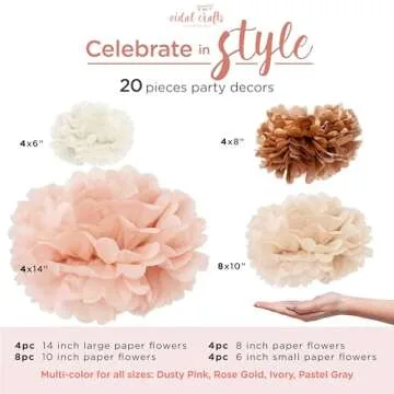 Show moreTransform any event into a visually stunning occasion with the Vidal Crafts 20-Piece Tissue Paper Pom Poms. These exquisite decorations come in a beautiful blend of blush pink and rose gold, designed to add a touch of elegance and whimsy to your celebrations. Each pack includes 20 pieces in four different sizes ranging from 6 to 14 inches, making them perfect for various settings – from intimate baby showers and vibrant birthday parties to chic bridal showers and elegant weddings. With their easy-to-assemble design, you can effortlessly create stunning displays that will captivate your guests and enhance your themed decor.