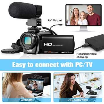 Video Camera Camcorder, FHD 1080P 24MP Camcorders Youtube Vlogging Camera 16X Digital Zoom 3.0 Inch 270 Degree Rotation Screen Video Camera Recorder with Microphone, Remote and 2 Batteries