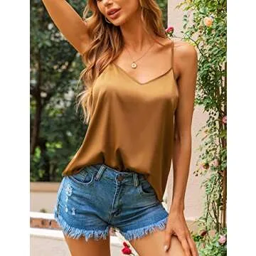 VIDUSSA Tops Tank Silk for Women Satin V Neck Cami Top Silk Camisole Loose Sleeveless Blouse Tank Shirt Khaki S