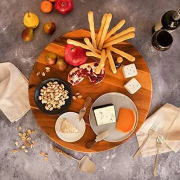 Show more Introducing the Villa Acacia Lazy Susan, the perfect blend of functionality and elegance for your kitchen. This 22-inch round wooden turntable organizer is designed to enhance your serving experience and elevate your kitchen aesthetics. Crafted from 100% acacia wood, each piece showcases unique patterns and textures that make it truly one-of-a-kind. The premium quality materials not only ensure durability but also add a rustic charm that your guests will admire. With its innovative 360-degree rotation, you can effortlessly access your favorite ingredients and condiments, making serving dinner parties a breeze.
