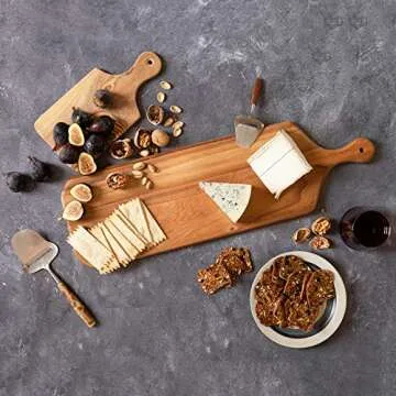 Versatile enough for various uses, the Villa Acacia Cutting Board shines not only as a bread board but also excels as a cutting surface for cheeses or meats, a decorative display board for garnishes, or a chic platter for charcuterie. Its aesthetic appeal also ensures it will beautifully showcase home decor items when not in use, bridging the gap between functional kitchenware and artistic display.
