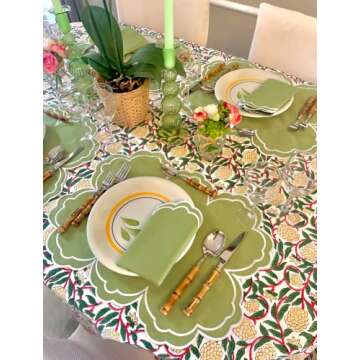 Show moreElevate your dining experience with the exquisite Villa Positano Washable Placemats, designed to add a touch of elegance to any meal, whether it's an intimate dinner for two or a lively garden party. This set of 4 placemats features a stunning Amalfi Green scallop edge design, crafted from 100% organic cotton canvas that not only highlights sustainability but also ensures durability and style. Measuring 19 inches by 15 inches, these placemats are perfect for all tables, bringing beauty and practicality to your dining setup.