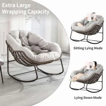Villeston Outdoor Papasan Rocking Chair - Oversized Comfy Patio Chair Indoor Egg Royal Rattan Rocking Chair with Cushion for Front Porch Lounge Lawn Bedroom Living Room (Beige Grey)