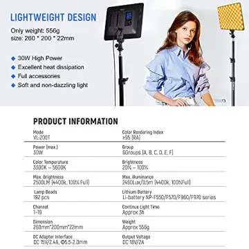 Show moreIntroducing the ultimate lighting solution for professionals and enthusiasts alike, the VILTROX 2 Packs LED Video Light Kit is meticulously designed to elevate your photography and videography experience. Powered by 192 high-quality LED beads, each panel delivers an impressive 30W of power, ensuring optimum brightness and a versatile color temperature range from 3300K to 5600K. With a remarkable Color Rendering Index of 95+, this kit beautifully captures the true colors of your subjects, allowing your creativity to shine!