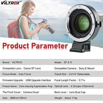 Introducing the VILTROX EF-E II 0.71x Auto Focus Reducer Speed Booster Adapter, your ultimate companion for transforming Canon EF lenses into versatile tools for Sony E-Mount cameras. This innovative adapter is engineered specifically for those using full-frame models like the Sony A7 series and the NEX-VG900, offering seamless connectivity and outstanding performance. With a 0.71x focal length multiplier, it enhances your shooting capability by accelerating the focusing...