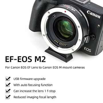 Show moreThe VILTROX EF-EOS M2 Speed Booster is an innovative solution for photographers looking to harness the full potential of their Canon EF lenses on the Canon EOS M series cameras. This state-of-the-art adapter not only facilitates the seamless mounting of Canon EF lenses onto your M50 II, M6 II, M200, M50, M6, or M5, but it also enhances your shooting experience by allowing full compatibility with all camera features—including autofocus and image stabilization. The carefully engineered design increases the lens aperture by one f-stop, enabling better light transmission and stunning bokeh effects that elevate your photography to the next level.