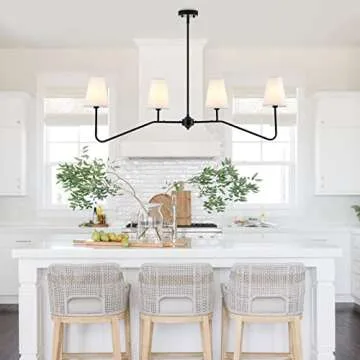 Show more This stunning 4-light linen pendant light is an exquisite blend of modern elegance and functionality, designed to illuminate your spaces with a captivating charm. Constructed with slender rods and a soft, white fabric shade, it's a versatile addition perfect for any room needing an aesthetic enhancement. Measuring 46.77in x 5.51in x 14.96in, this pendant light offers an adjustable rod length of up to 51.88 inches, ensuring a customized fit for your dining room, kitchen island, entryway, or corridor.