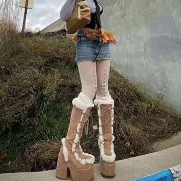 VIMISAOI Womens Mid Calf Boots, Lace Up Zip Block Chunky High Heel Punk Goth Warm Fur Winter Snow Platform Boots