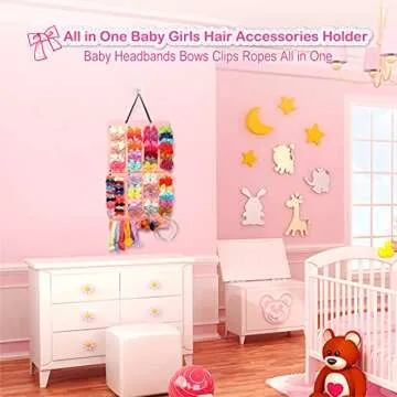 Show more Introducing the Vimiv Hair Bows Holder & Organizer, your ultimate solution for transforming cluttered hair accessories into a beautifully organized display. This innovative organizer features an impressive large storage capacity with 16 ribbons designed to hold up to 150 small hair bows, as well as 2 detachable snaps for up to 20 headbands. Measuring at 26 x 13.7 inches and weighing only 0.39 LB, it fits perfectly in any nursery, making it an essential addition to your baby’s room. Say goodbye to messy drawers and hello to a neat, accessible collection of accessories that brings joy to your little one!