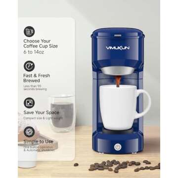 Show more Experience the ultimate coffee indulgence with our revolutionary single serve coffee maker that masterfully blends convenience and performance. This Vimukun Coffee Maker is designed for those who appreciate every drop of their beloved brew, delivering a delectable cup of coffee in moments. Imagine having the freedom to brew your favorite blends, whether it’s with K-cup pods or rich, aromatic ground coffee. This innovative coffee maker is not just about facilitating a single cup; it’s about tailoring your coffee experience to perfection.