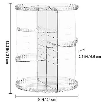 Show moreIntroducing the Vinmoso Makeup Organizer—a perfect blend of style and functionality for all cosmetic enthusiasts. Designed to simplify your beauty routine, this 360-degree rotating makeup organizer boasts a sleek and elegant appearance, with four spacious trays to house your entire collection. With a thoughtful design that allows for easy access to your favorite makeup products, it transforms even the smallest vanity or dresser into an organized oasis. Measuring at 12.2 inches in height and 9.2 inches in diameter, this large-capacity organizer provides ample space while maintaining a slim profile that fits effortlessly into any corner.