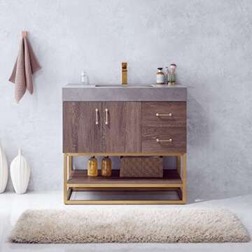 Show moreThe Vinnova 789036-NC-WK-NM Alistair Bathroom Vanity is the perfect fusion of elegance and practicality. Crafted with precision, this stunning piece boasts a beautiful North Carolina Oak finish, offering a warm and inviting ambiance to your bathroom. The innovative design integrates a moisture-proof board with premium metal components, ensuring durability that stands the test of time. The added touch of the brushed gold metal or matte black bracket support base frames the vanity with a modern edge, while the spacious open-type fixed shelf provides ample storage for your essentials. Paired with a chic grey sintered stone countertop, this vanity elevates any bathroom decor.