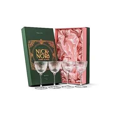 Show more Indulge in the charming nostalgia of cocktail culture with the stunning Vintage Art Deco Nick and Nora Coupe Glasses. This exquisite set of four, beautifully crafted from premium crystal glass, is designed to enhance your cocktail experience whether you're mixing classic Martinis, Manhattans, or modern favorites like Margaritas and Daiquiris. Each 5 oz glass features elegant ribbed lines that effortlessly blend retro aesthetics with contemporary style, making them a centerpiece of any home bar.