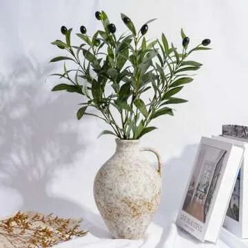 Vintage Ceramic Vase with Fake Olive Branches, Farmhouse White Vase with 2Pcs Faux Olive Plant Greenery for Home Bedroom Living Room Side Table Entryway Dining Table Decor