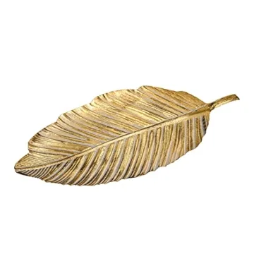 Show moreIntroducing the Vintage Iron Gold Leaf Style Serving Tray, a stunning addition to any home decor that seamlessly blends functionality with artistic flair. This exquisite tray is crafted from durable iron, showcasing an elegant gold finish. Its unique leaf-shaped design adds a touch of nature's beauty to your living space while serving multiple practical purposes. Sized at 17.7 x 8.5 x 0.8 inches, it's the perfect balance of compactness and spaciousness, making it ideal for organizing jewelry, perfume, candles, and other accessories while also doubling as a decorative centerpiece.