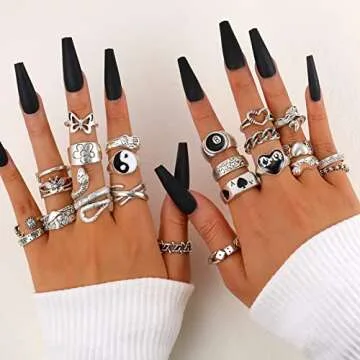 Vintage Silver Open Punk Rings for Men Women, 24PCS Adjustable Rings, Alt Rings, Chunky Silver Rings, Bulky Rings, Hippie Rings ,Cool Gothic Ring,Statement Stacking Ring, Skull Snake Star Flower Heart Eboy Emo Y2K Ring (Style-1)