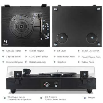 The record player is designed for superior sound quality, featuring a belt-driven anti-vibration system that minimizes distortion, ensuring that each note is delivered with clarity. To protect your cherished records, it comes equipped with a removable transparent dust cover, safeguarding them from dust and damage.