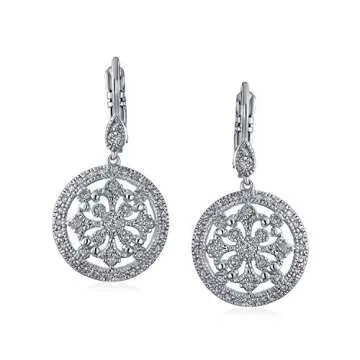 Vintage Style Bridal Sorcerer Shield Circle Round Compass Cubic Zirconia CZ Prom Dangle Earrings Silver Plated Brass