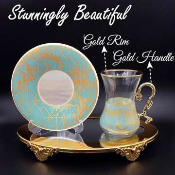 Show more Discover the exquisite allure of our Luxury Turkish Tea Glasses and Saucers Set, an elegant assemblage of 6 beautifully designed pieces that promise to elevate your tea-drinking experience. Each glass is meticulously crafted from premium raw glass, ensuring not only stunning visual appeal but also exceptional durability. The intricate gold decor accents add a touch of opulence, making this set perfect for formal gatherings or afternoon tea parties.