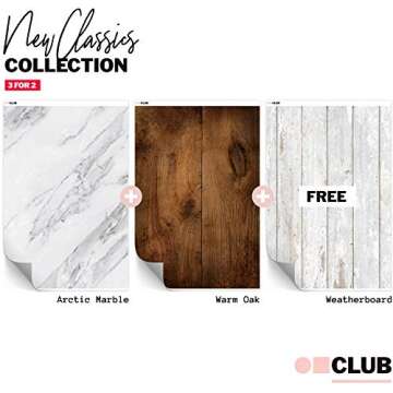 Vinyl Photography Backdrop 3-Pack for Product, Flat Lay & Food Photography - Arctic Marble, Warm Oak & Weatherboard - 2 x 3ft / 60 x 90cm