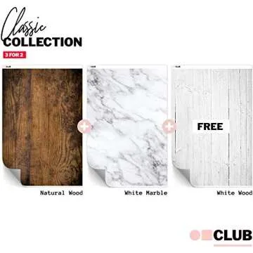 Show more Introducing our Vinyl Photography Backdrop 3-Pack, your ultimate solution for professional-grade product, flat lay, and food photography. This set includes three stunning backdrops featuring Natural Wood, White Wood, and White Marble designs, each measuring approximately 2 x 3ft (23 x 35in). Crafted from high-quality vinyl, these backdrops not only provide a clean aesthetic but also enhance the presentation of your products with their realistic textures and colors. Whether you are a small batch skincare company, food blogger, or content creator, these backdrops will elevate your photographic endeavors. They arrive well-packaged for your convenience and are designed to maintain their quality through numerous uses, allowing for easy maintenance and storage.