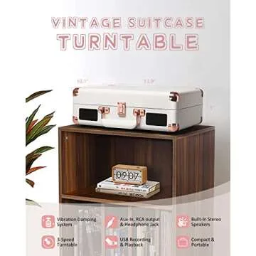 For those looking to preserve their vinyl treasures, the built-in USB record function allows you to convert your analog favorites into digital MP3 or WAV files easily, ensuring your memories last a lifetime. With its stylish vintage suitcase design featuring a white finish and elegant rose gold metal hardware, this record player isn’t just an audio device; it’s a statement piece that adds flair to any room. Lightweight and portable with a sturdy handle, you can bring the joy of music wherever you go.
