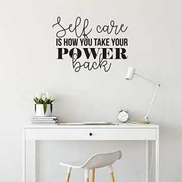 Show more Transform any space into a haven of positivity and inspiration with our stunning Vinyl Wall Art Decal - Self Care is How You Take Your Power Back. Measuring a generous 22" x 30", this modern sticker is expertly crafted to serve as a daily reminder of your own strength and worth. Made from premium, durable vinyl, it boasts a sleek black finish that seamlessly integrates into various decor styles, whether in your home, classroom, or office. Installation is a breeze with its peel-and-stick application, ensuring a quick and hassle-free decor upgrade that can resonate with your personal journey towards self-empowerment.