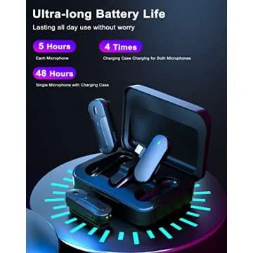 The microphone itself can last up to 5 hours, while the charging case extends total usage time to approximately 48 hours.
