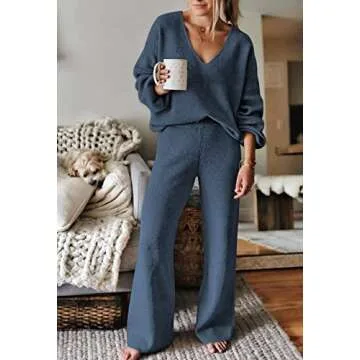 Introducing the **Viottiset Women's 2 Piece Outfits Casual V Neck Knit Wide Leg Sweater Lounge Set** in a stunning light blue shade, designed for ultimate comfort and ease. This versatile loungewear set is crafted from soft, breathable materials to keep you cozy all day long, whether you’re lounging at home or out and about. The set features a stylish **V-neck pullover with ribbed knit detailing** that adds a touch of elegance while maintaining a relaxed vibe, perfectly complemented by long batwing sleeves...