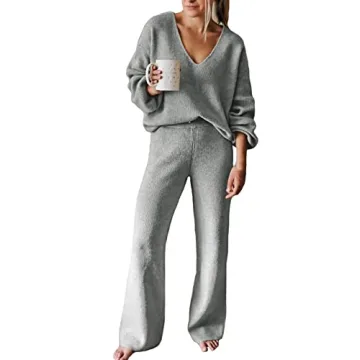 Show more Indulge in the ultimate comfort with this stunning 2-piece outfit, a casual knit sweater lounge set that perfectly blends style with relaxation. Designed for today's modern woman, this set features a chic V-neck pullover ribbed knit sweater top, complemented by long batwing sleeves that drape gracefully from the shoulders. The wide-leg high waist pants are a true highlight, featuring an elastic waistband that ensures a relaxed fit whether you're lounging at home or enjoying a day out.