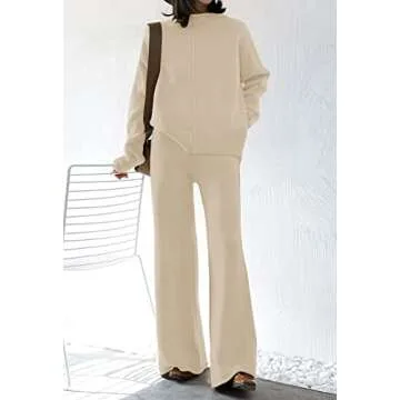 Viottiset Women's 2 Piece Outfits Sweater Set Wide Leg Pants High Neck Sweatsuit Fall Winter Knit Loungewear Apricot L
