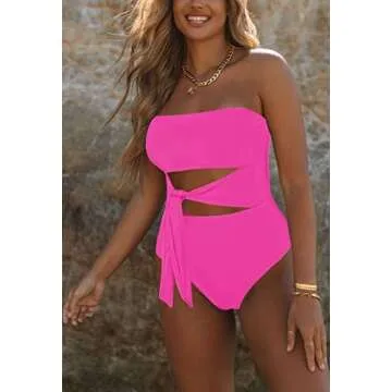 Viottiset Women's Bandeau One Piece Swimsuit Strapless Tie High Cut Out Bathing Suit Hot Pink Small