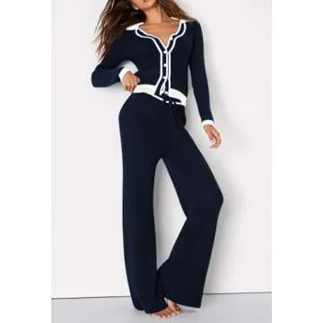 Viottiset Women's Lounge Sets 2 Piece Outfits Knitted Button Sweatersuit Wide Leg Pants Tracksuit Navy X-Large