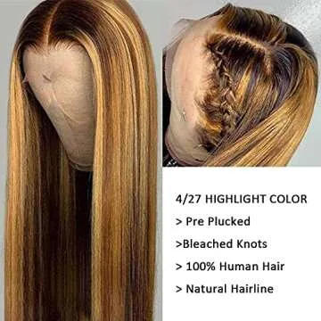 Show more The perfect blend of elegance and versatility is here with our stunning Brazilian Human Hair Lace Front Wig, featuring a beautiful 4/27 highlight color to elevate your style effortlessly. Crafted from 100% premium Brazilian human hair, this wig boasts a luxurious texture that feels as real as your own hair, ensuring that you turn heads wherever you go. Its 150-density provides a full and voluminous look while remaining soft and tangle-free, making it a joy to wear all day long.