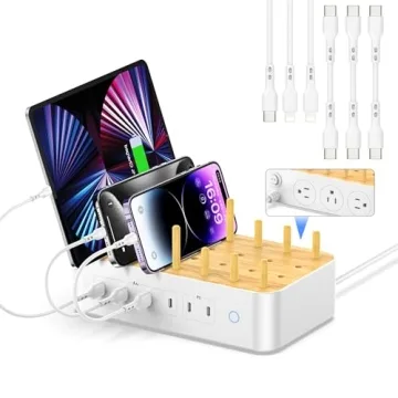 Show more Introducing the VisionSync Bamboo USB-C Charging Station – your ultimate charging solution designed for both functionality and aesthetic appeal. This state-of-the-art charging dock boasts a robust 60W power capacity and is equipped with 3 AC outlets, 3 USB-A ports, 1 USB-C port, and 2 Power Delivery (PD) ports, enabling you to power up to 9 devices simultaneously. No more scrambling for multiple chargers! With its sleek design, crafted from 100% natural bamboo renowned for both durability and sustainability, this charging station melds perfectly into any setting.