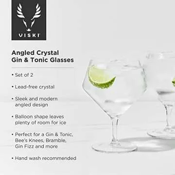 Show moreIndulge in the luxurious experience of sipping your favorite gin & tonic with the Viski Angled Stemmed Gin & Tonic Glasses. This premium set of two 14oz glasses is not just a gift; it's an invitation to a sophisticated drinking experience. Expertly crafted to accentuate the delicate botanical notes of gin, these glasses feature a unique angled design that adds elegance and modern flair to any at-home bar. Constructed from durable crystal, they provide a beautiful presentation while ensuring you can enjoy your drinks for many years.