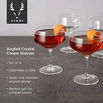 Viski Raye Angled Stemmed Crystal Coupe Cocktail glassess, Champagne Coupe Glasses, Drinkware Set, Espresso Martini glasses set of 4, 7oz